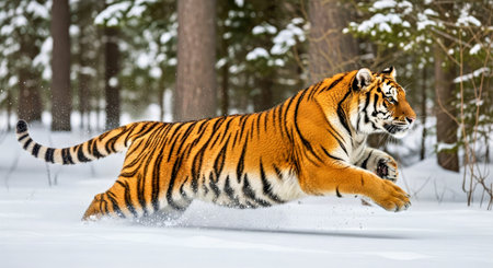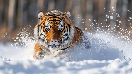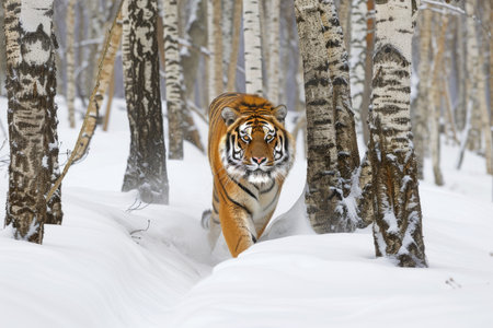 Siberian Tiger running in snow. Beautiful, dynamic and powerful photo of this majestic animal. Set in an environment typical for this amazing animal. Birches and meadows