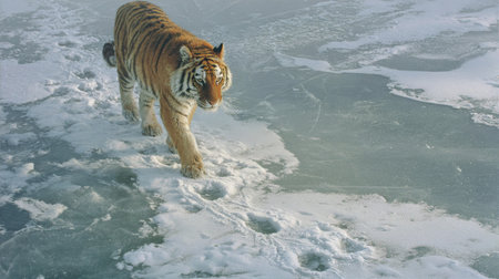 Tiger walks on snow-covered ground