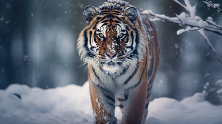 A Bengal Tiger in a snowy Forest hunting for prey.