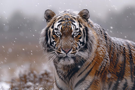 Tiger in winter snowfall. The Siberian tiger (Panthera tigris altaica).