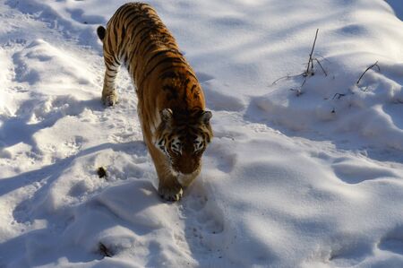 Tiger at the zoo walks in the snow on a winter day