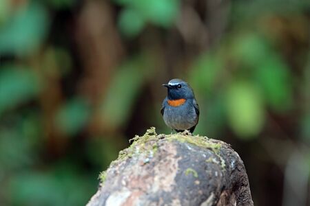 Cute little Red-throated Flycatcher is on the rock. Beautiful shape of rock and green blurred background. Bright sunlight. Winter visitor in Thailand. Khao Yai National Park.