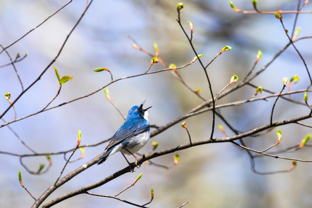 A beautiful Ultramarine Flycatcher, Ficedula superciliaris, sitting on a tree branch with blurry background