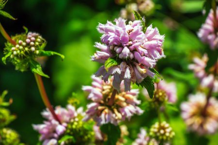 Leonurus showcases clusters of soft pink flowers amid vibrant green foliage growing abundantly in a lush environment during midsummer.