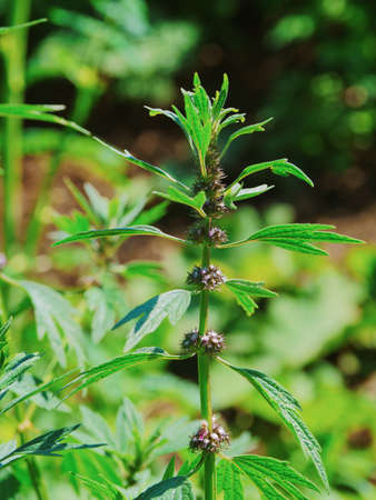 Leonurus cardiaca plant with green stem and leaves. Medical plant growing in a rustic vegetable garden.
