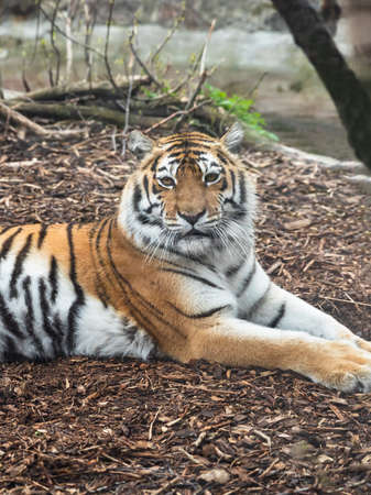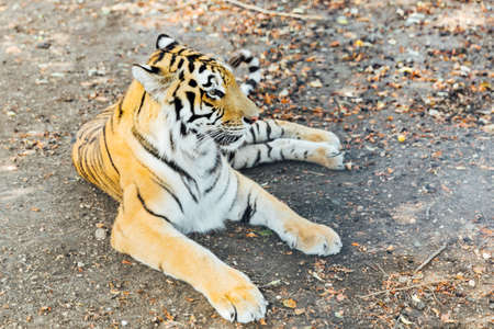 Tiger portrait. Tiger resting in the zoo. The tiger is out for a walk and is relaxed.