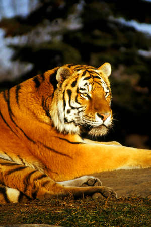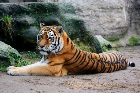 Siberian (Amur) tiger looks over his territory while rssting on a rock. Calgary Zoo, Calgary, Alberta, Canada