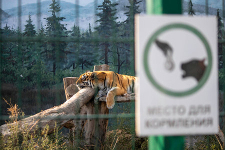 Amur tiger in a cage in a safari park, selective focus