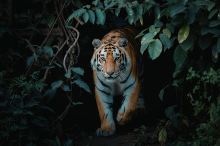 A powerful tiger walks through a dense forest, its orange and black stripes standing out against the lush green foliage.