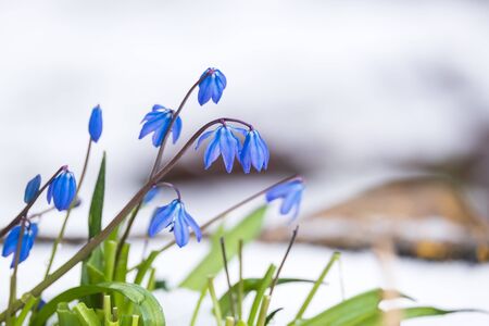 blue snowdrop, flowers in the forest on a background of dry leaves, close up