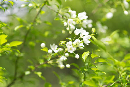 photo of the flowering Crabapple tree with white flowers on the green bokeh background macro