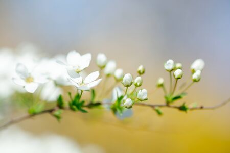 Branch of flowering bird cherry in white flowers on a spring sunny day.