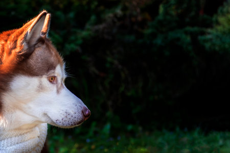 Closeup portrait red brown siberian husky dog on dark forest background in sunny day. Copy space