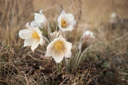 Pasque flowers on spring field. Photo Pulsatilla grandis with nice bokeh.