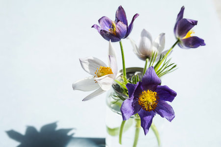 Bouquet of first spring wildflower Pulsatilla Vulgaris in plastic bottle. Springtime minimal still life, concept of reduce waste.