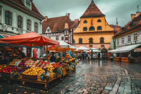 Vibrant market scene in piata mare square, sibiu, featuring colorful stalls with fresh produce and flowers, surrounded by historic buildings. the bustling atmosphere showcases a blend of tradition and modern urban life, perfect for travel-themed designs.