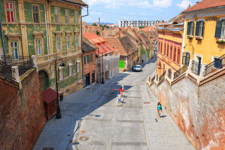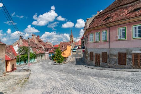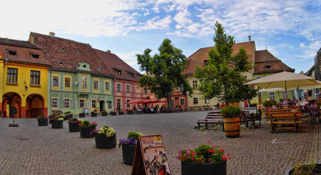 Sighisoara, Romania, 13 July 2021: Old colorful painted houses in the historical center of the Sighisoara citadel, in Transylvania (Transilvania) region, in a sunny summer day