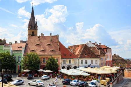 Sibiu, Romania - July 19, 2014: Old Town Square in the historical center of Sibiu was built in the 14th century, Romania
