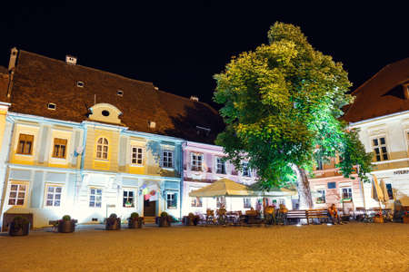 SIBIU, ROMANIA - JUNE 19, 2017: View on the medieval street with ancient houses, outdoors cafe and people at the sunset time.