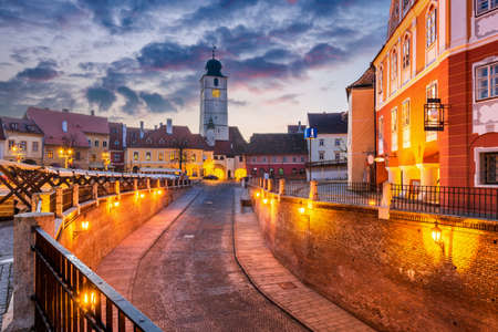 Sibiu, Romania - Lesser Square and Council Tower at twilight. Transylvania saxon city.