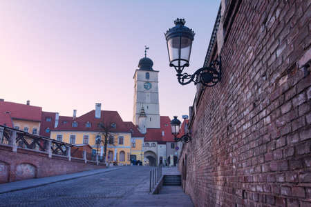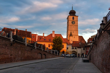 SIBIU, ROMANIA - JUNE 19, 2017: View on the Council Tower in the street with medieval houses at the sunset time.