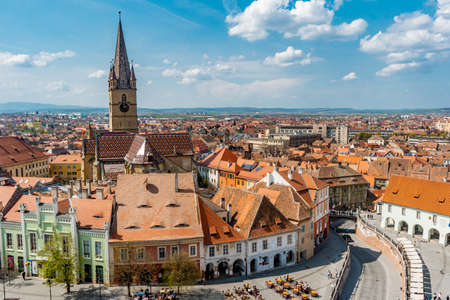 Aerial view of Sibiu old town in Transylvania, Romania, Lutheran cathedral tower and Small Square (Piata Mica)