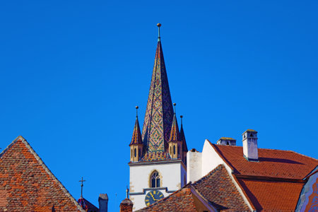 Sibiu - Romania, July 18, 2017: Transylvania. Lutheran Church, built in the Huet Square, seen from the streets of medieval Lower Town city