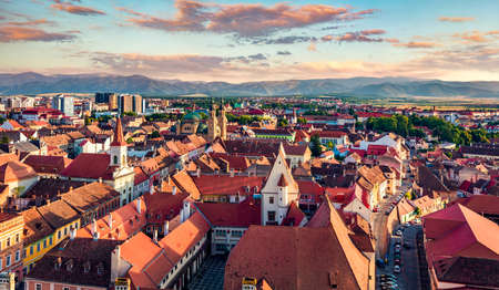 Fantastic sunset in Transylvania, Romania, Europe. Great summer view of Tower of Council. Aerial cityscape of Sibiu town. Traveling concept background.