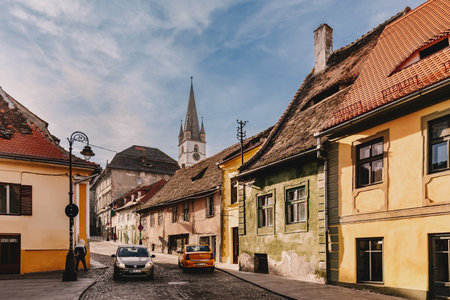 SIBIU, ROMANIA - July 21, 2018: Sibiu, Romania - Beautiful street with Lutheran Cathedral of Saint Mary on a sunny summer day with blue sky in Sibiu, Romania.