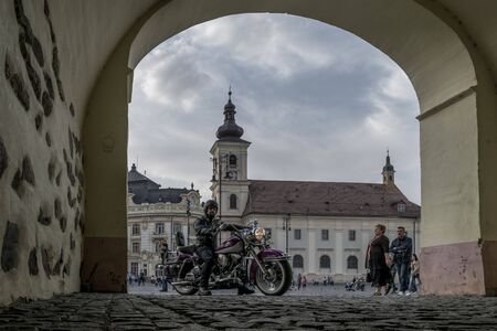 A man on a motorbike standing in front of the big square in Sibiu, Romania