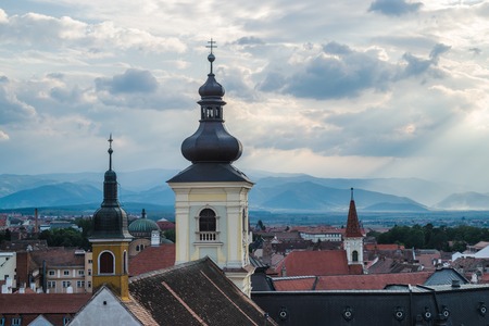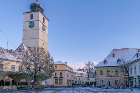 Sibiu, Romania - Lesser Square and Council Tower morning cloudy day, Transylvania saxon city.