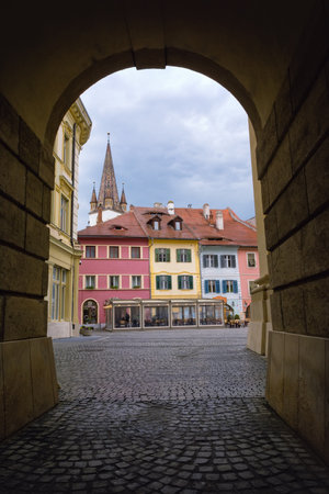 Cityscape with beautiful old buildings in historical center of Sibiu town Transylvania, Romania, Europe