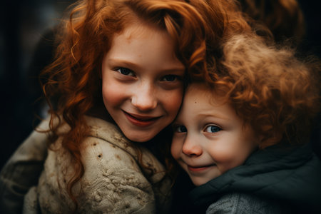happy children, laughing kids hugging each other, closeup portrait of boy and little girl, happiness in childhood of siblings