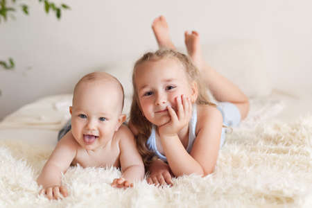 Two cute siblings hugging and smiling on the bed light background in a real interior. Concept childhood and family relations