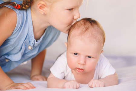 Lifestyle closeup portrait of cute white Caucasian girl sister kissing little baby, lying on bed indoors. Older sibling with younger brother newborn. Family love bonding together concept.