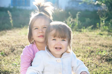 sisters portrait outdoors at sunny day. happy smiling sibling