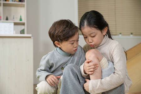 Little brother with his baby sister. Toddler kid Family with children outdoor.
