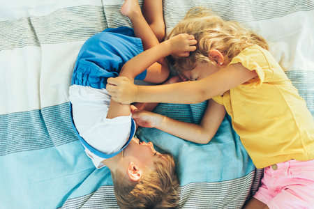 Two children boy and girl fooling around having fun together. Happy childhood concept.