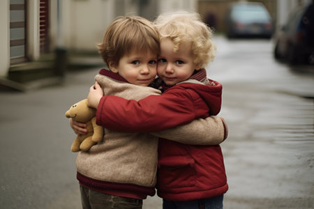 Cute little kids siblings hug and cuddle at home show love and care, small girl sister embrace hurt upset preschooler brother, take care of cousin, family relationships, children support concept