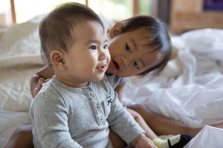 toddler brother and sister sitting on bed together. Lifestyle family concept