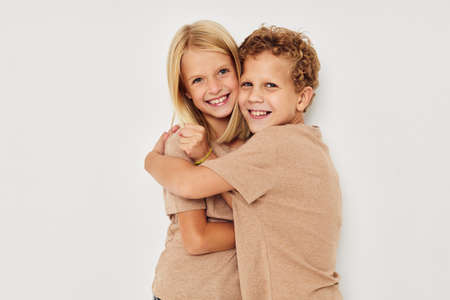 picture of positive boy and girl cuddling fashion childhood entertainment isolated background