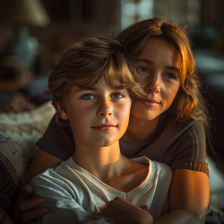 Brother and sister love. Portrait of a cheerful brother and sister holding each other while being seated on a couch at home during the day.