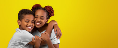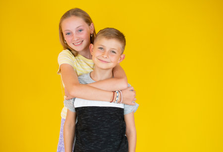 Siblings Sharing a Joyful Moment While Hugging Against a Bright Yellow Background