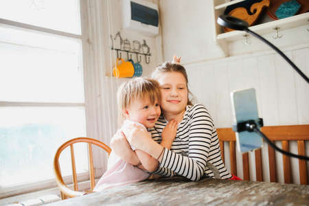 Sisters kids in kitchen shoots video and video chat, blogger kids broadcasting live video to social network. blogger teen girl influencer. Communications and vlog concept