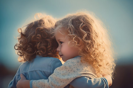 Two little girls are joyfully embracing each other while smiling brightly, showcasing their happiness and friendship in that moment