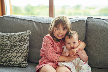 Two loving sisters on a cozy couch joyfully cherish their adorable newborn sibling