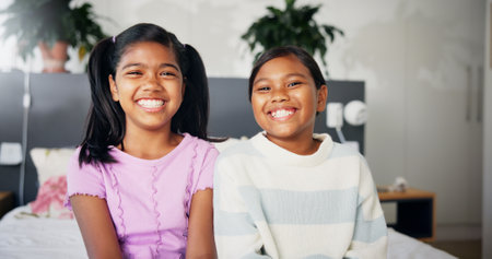 Girl, sisters and smile in portrait on bed for bonding, connection and support in bedroom. Happy family, siblings and confidence in home for weekend break, relax and relationship with love and care