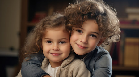 Lovely young sister and brother hugging indoor. Sibling children together portrait