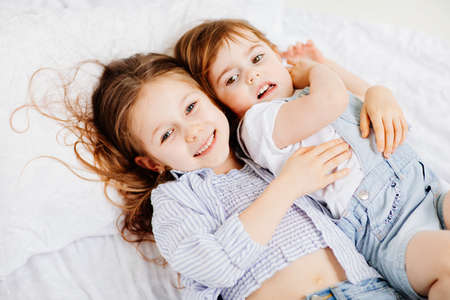 Lifestyle portrait of cute Caucasian girls sisters holding little baby on bed. Family love bonding together concept