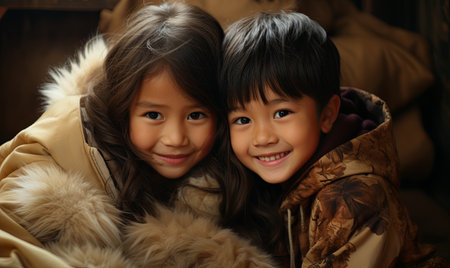 Smiling young sister and brother hugging indoor. Sibling children together portrait